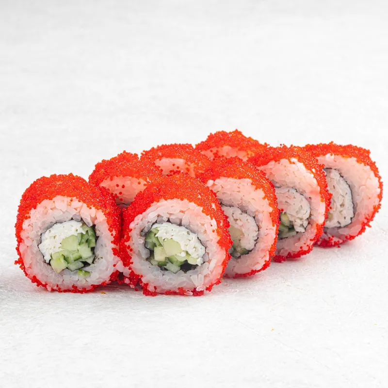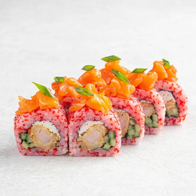 Лосось, креветка темпура, огурец, тобико, сыр филадельфия, зеленый лук