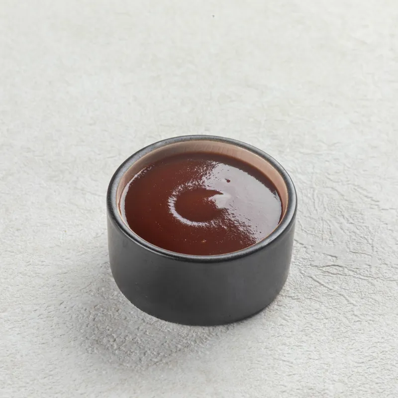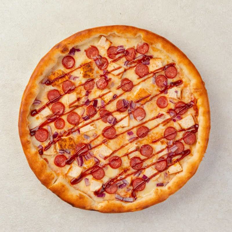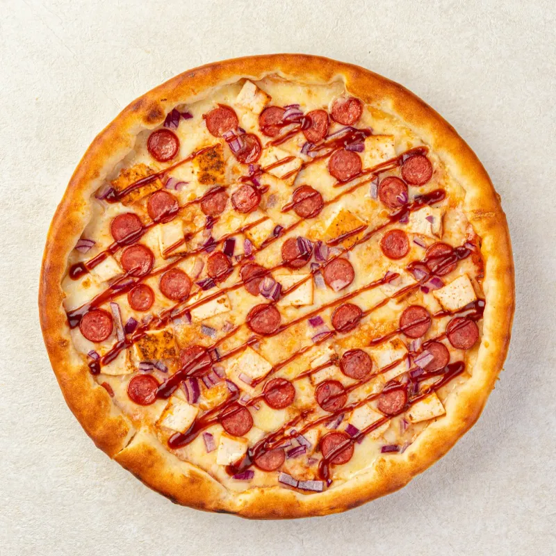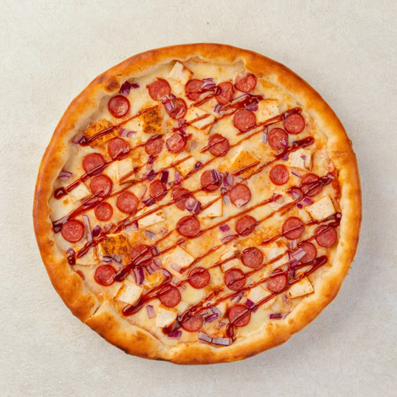 Томатный соус, охотничьи колбаски, запечённая курица, красный лук, сыр моцарелла и соус барбекю