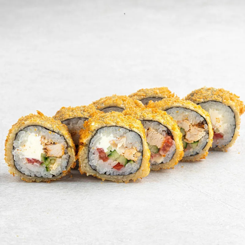 Курица, огурец, сыр филадельфия, картофель пай, кунжут, фирменный соус, унаги соус