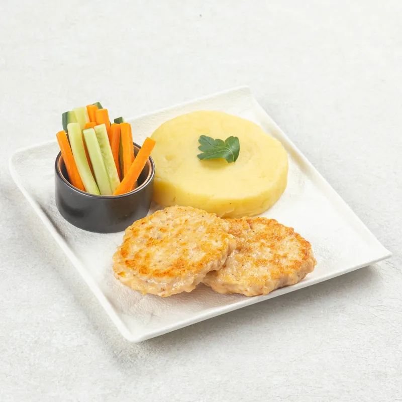 Нежные мини-котлетки подаются с картофельным пюре и овощными палочками из морковки и огурца.