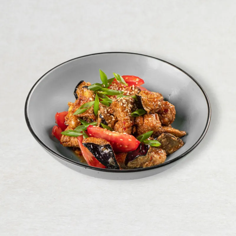 Баклажаны, курица, помидоры, кисло-сладкий соус, кунжут, зелёный лук