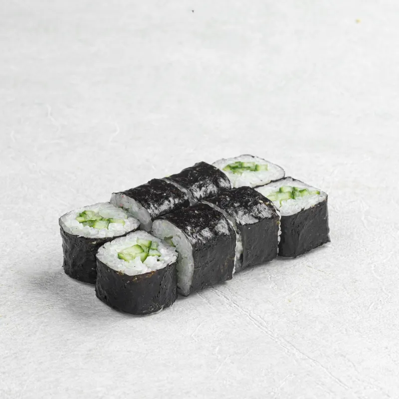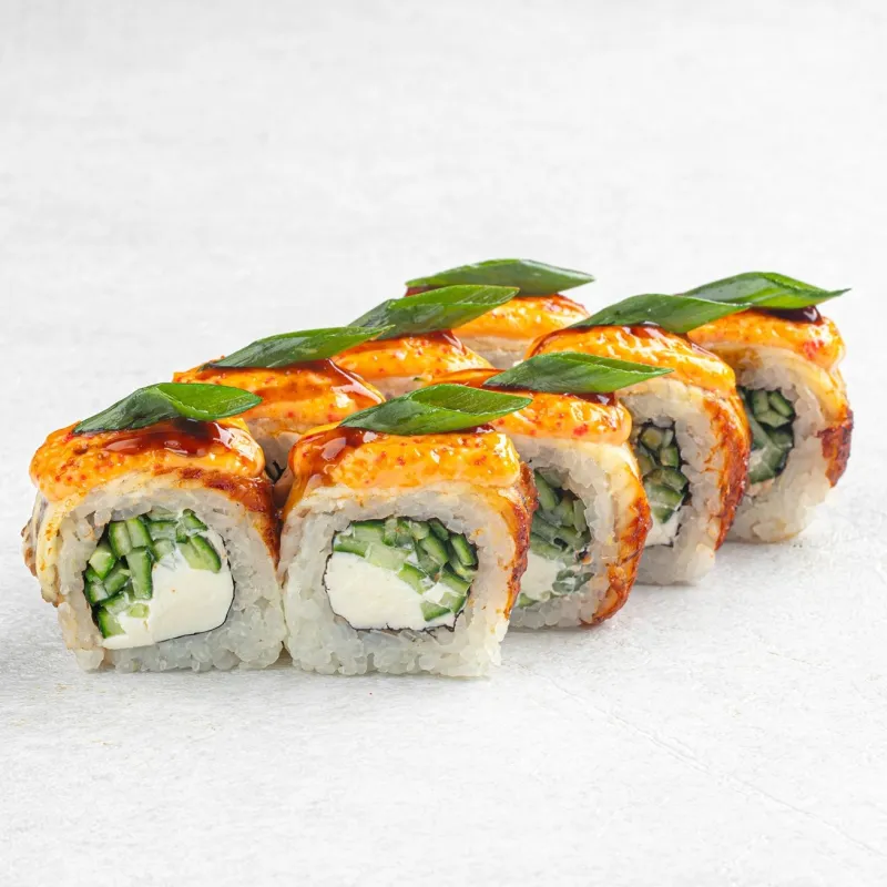 Огурец, соус том ям и унаги. Посыпается кунжутом. Начинка на выбор