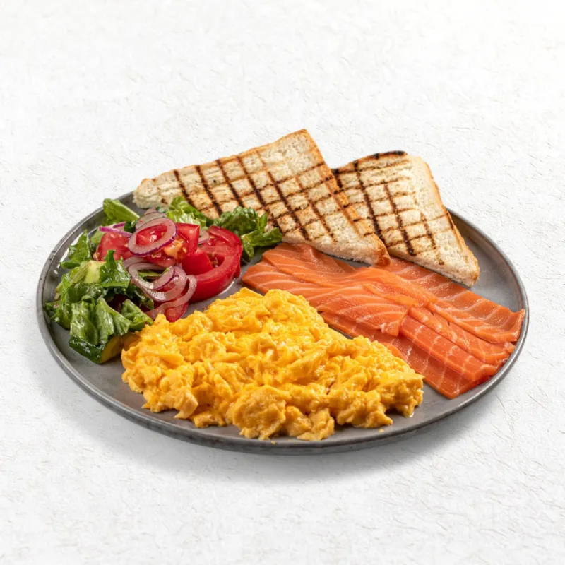 Свежий салат, копчёная сёмга, скрембл, тосты