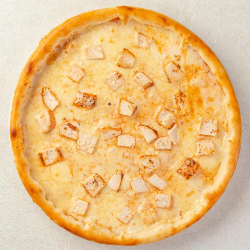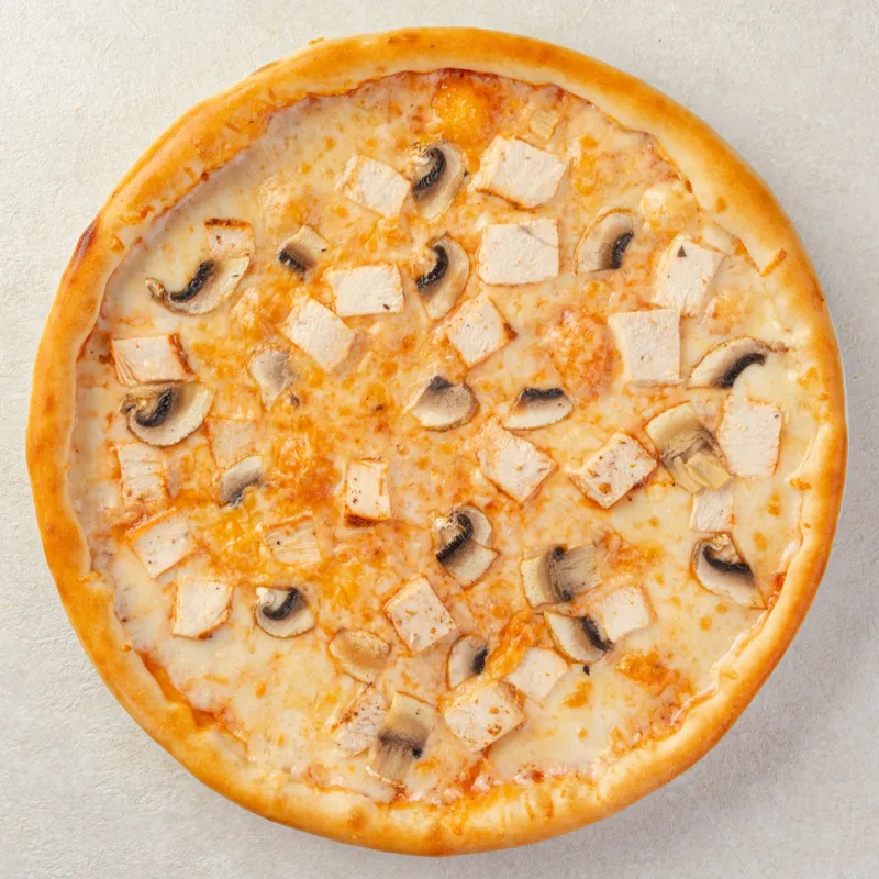 Томатный соус, запечённая курица, грибы, сыр моцарелла