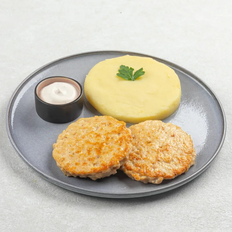 Нежные котлеты, картофельное пюре, соус. Подаётся с гарниром на выбор: пюре/рис.