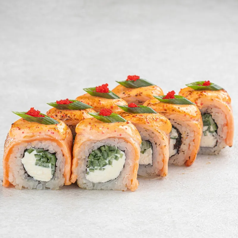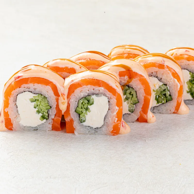 Лосось, огурец, сыр филадельфия, соус лава, тобико, зелёный лук, унаги соус