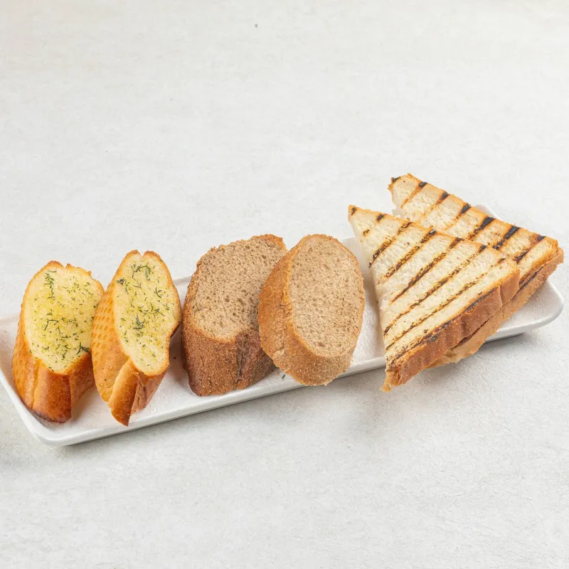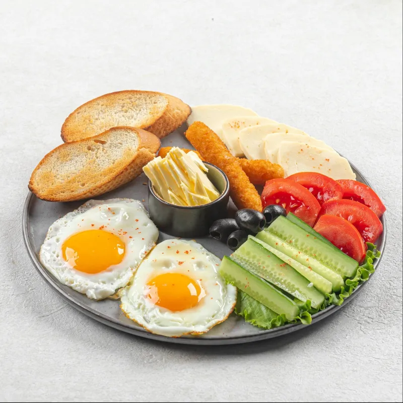 Глазунья, брынза, сырные палочки, свежие овощи, лист салата, маслины, сливочное масло, багет