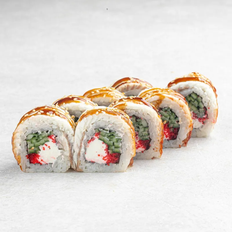 Угорь, огурец, тобико, сыр филадельфия, унаги соус, кунжут