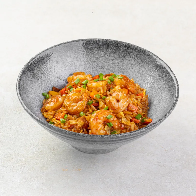Ароматный жареный рис с курицей или креветками на выбор, болгарский перец, омлет, лук и морковь. Украшается зелёным луком
