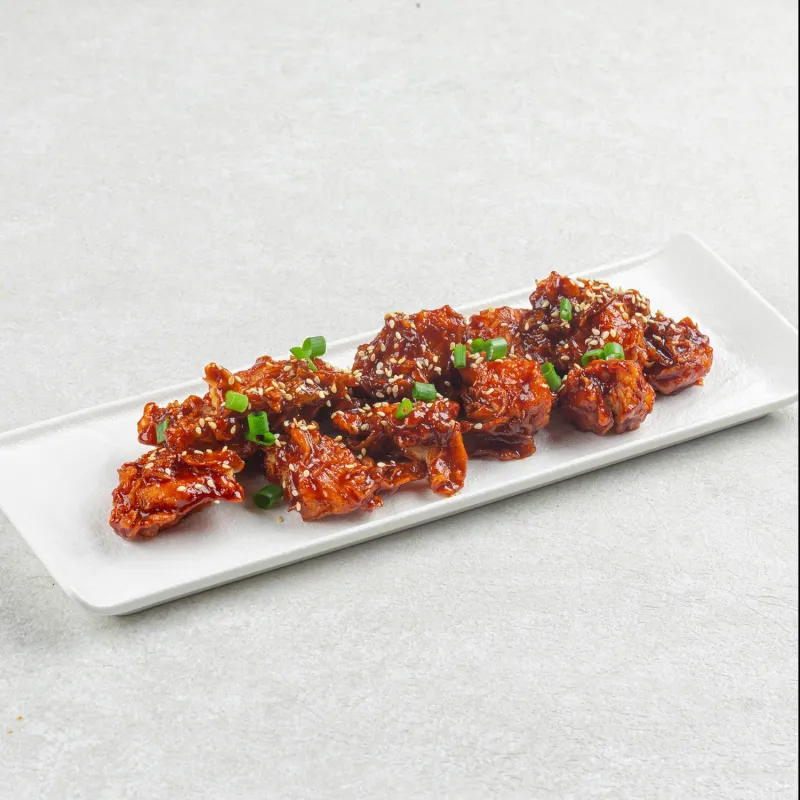 Хрустящие кусочки курицы в сладко-остром соусе по-корейски, с кунжутом и зелёным луком