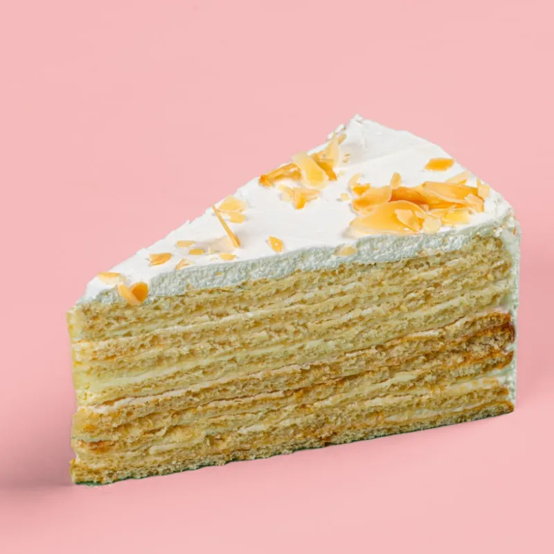 Воздушный бисквит-спонж на сгущённом молоке, прослоенный кремом из взбитых сливок и сгущёнки, украшенный тонкими миндальными слайсами