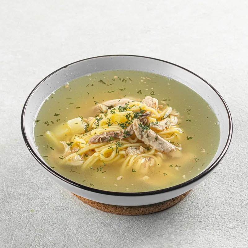 Лёгкий бульон с лапшой, нежной курицей, картофелем и укропом