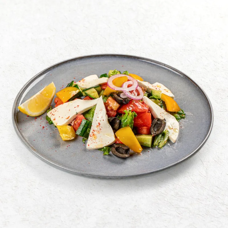 Листья салата, огурцы, помидоры, болгарский перец, красный лук, маслины, сыр фета, лимон, оливковое масло