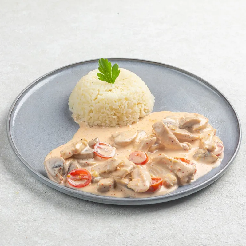 Нежные кусочки куриного филе, помидоры черри и шампиньоны в сливочном соусе, подаётся с гарниром на выбор: пюре/рис.
