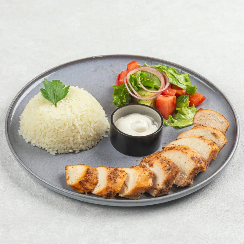Запечённая куриная грудка, свежий салат, белый соус, рис