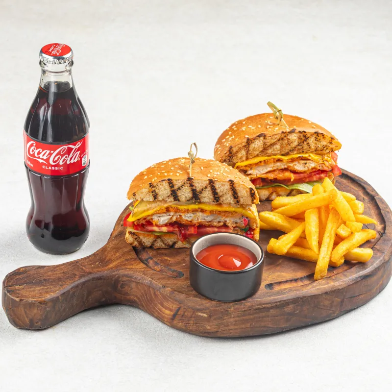 Фирменный бургер, фри, сoca-cola 0.25, кетчуп