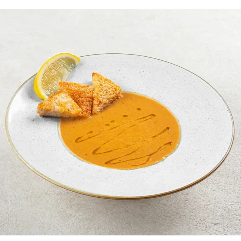 Крем-суп из чечевицы со специями, подаётся с сухарями и долькой лимона