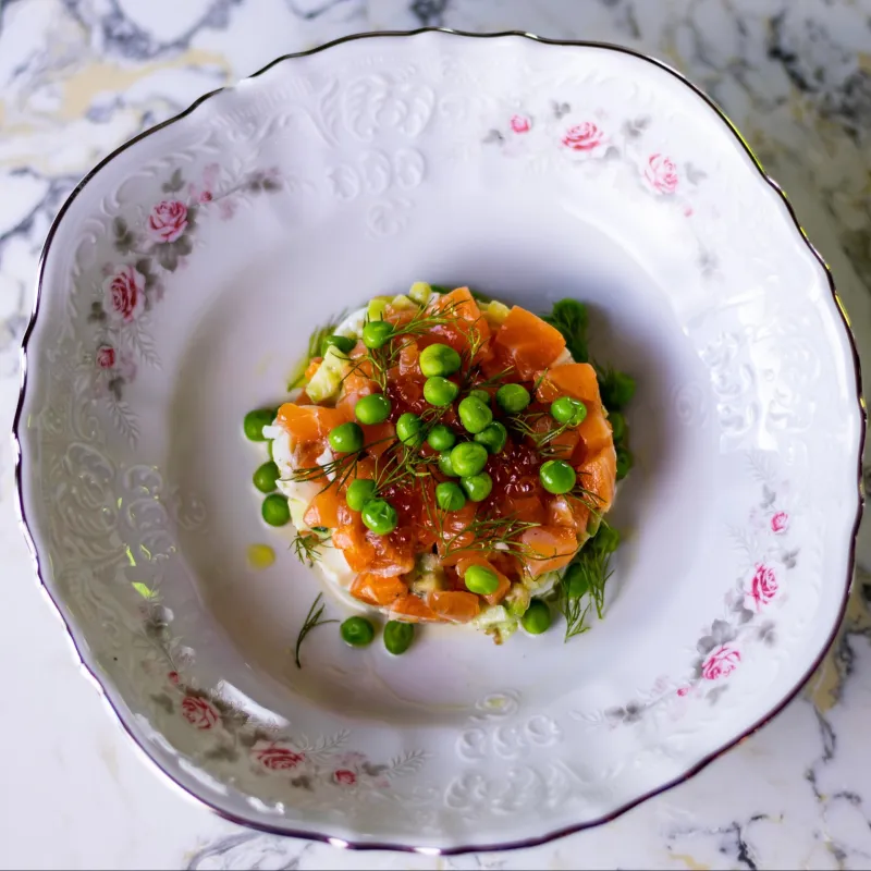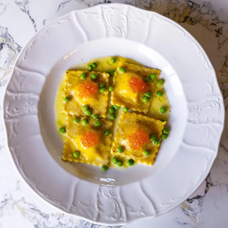 (икра, тесто равиоли, копченный лосось)