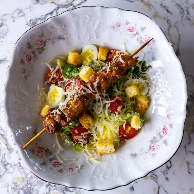 (романо, черри, сыр пармезан, цыпленок на шпажке, яйцо, соус цезарь)