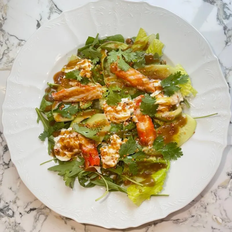 (салат руккола, ореховый соус, краб, огурцы, авокадо)
