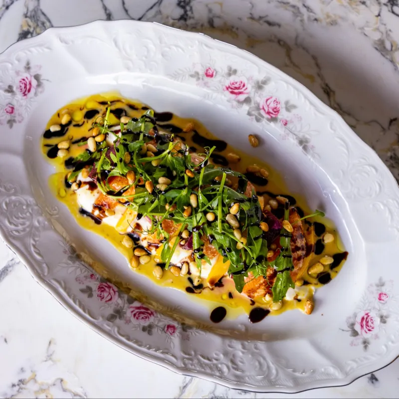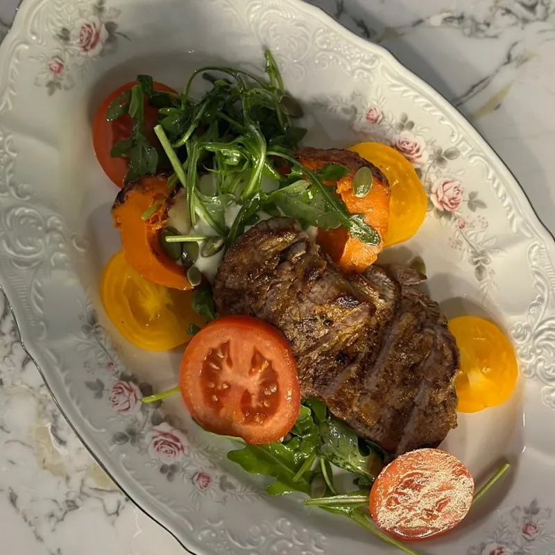 Теплый салат из бон филе говядины с тыквой и помидорами под сливочным соусом