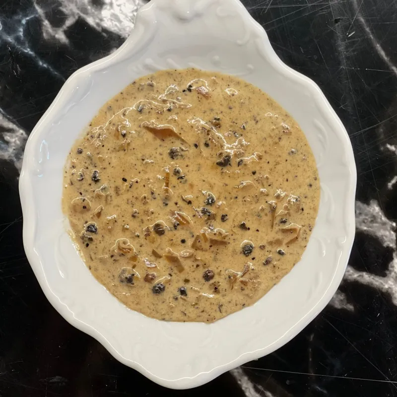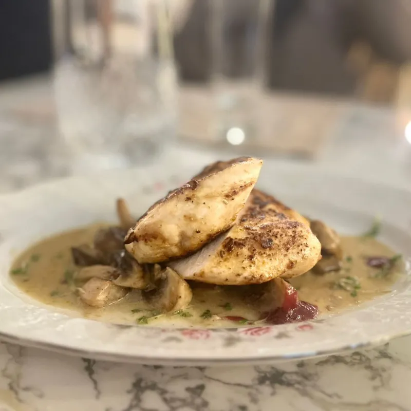 Сочная груда индейки под двойным грибным соусом, портобелло и белые грибы