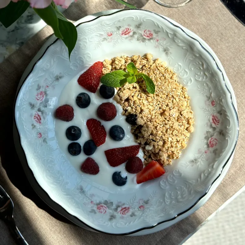 (гранолла запеченные мюсли, йогурт, ягоды по сезону)