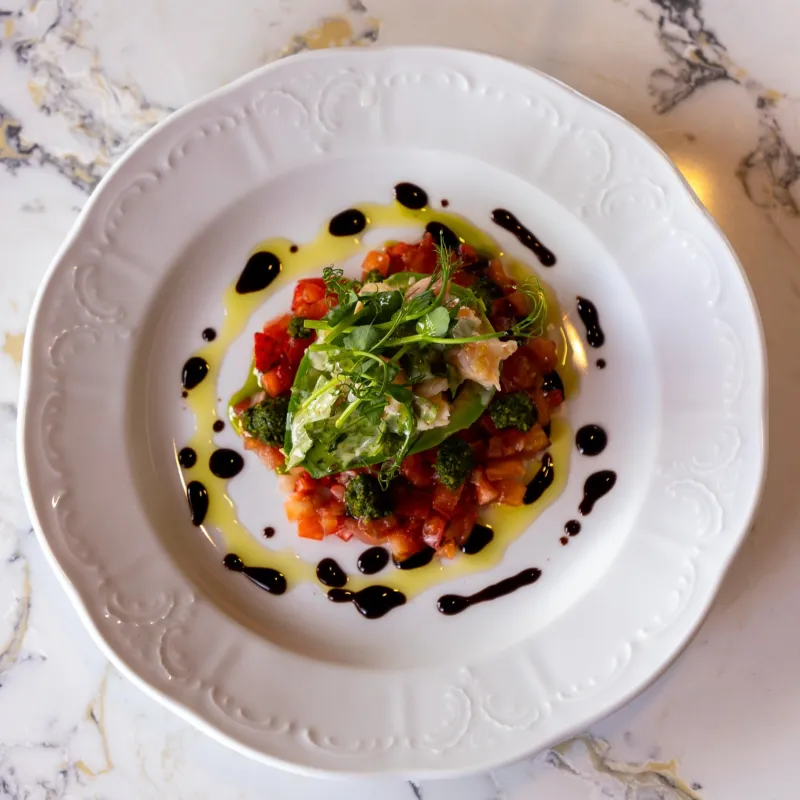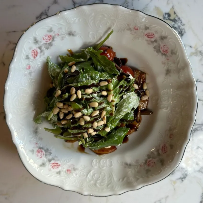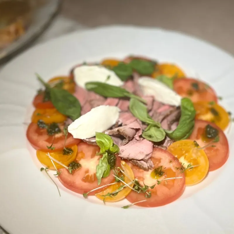 Салат с тающим во рту ростбифом, помидорами, соусами словчным и песто