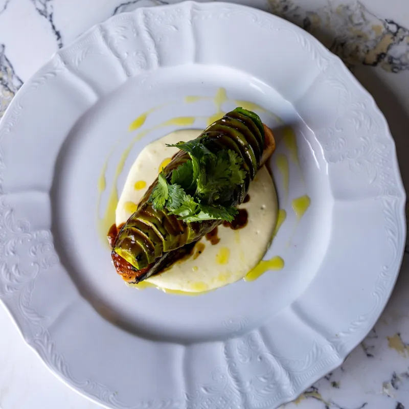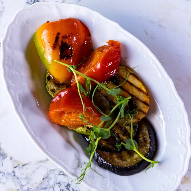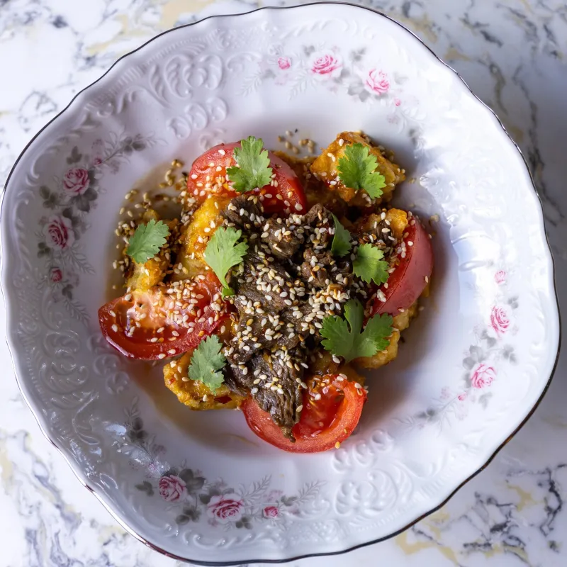 (баклажаны, мясо говядины, томаты, сладкий соус Чили)