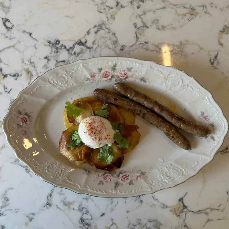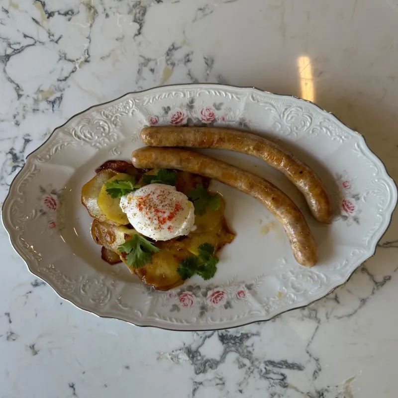 (колбаски говяжьи, картофель, яйцо, зелень)