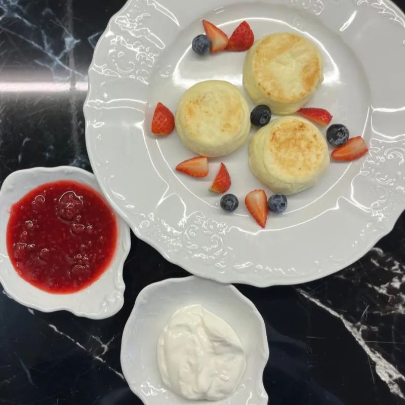(сырники, варенье малиновое, клубника)