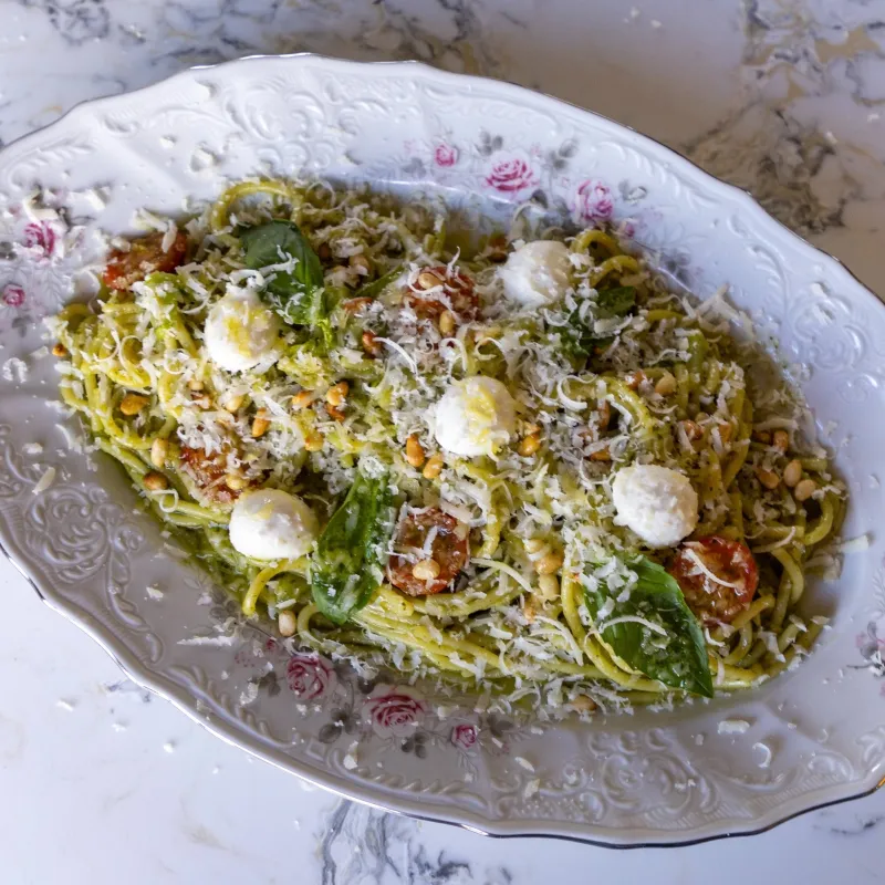(спагетти, цуккини, томаты, орех кедровый, соус песто)