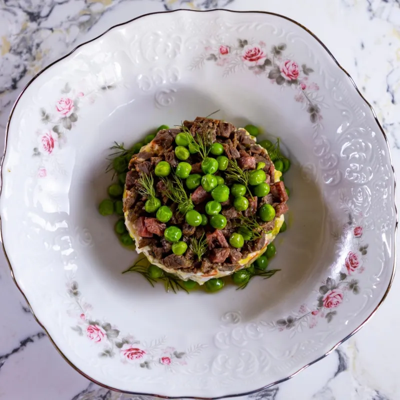 (огурцы соленные, картофель, горошек, яйцо, морковь, ростбиф говядины)