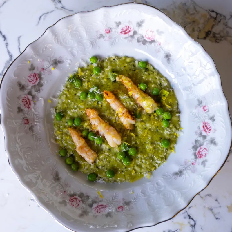 (рис, горошек, сыр пармезан, креветки)