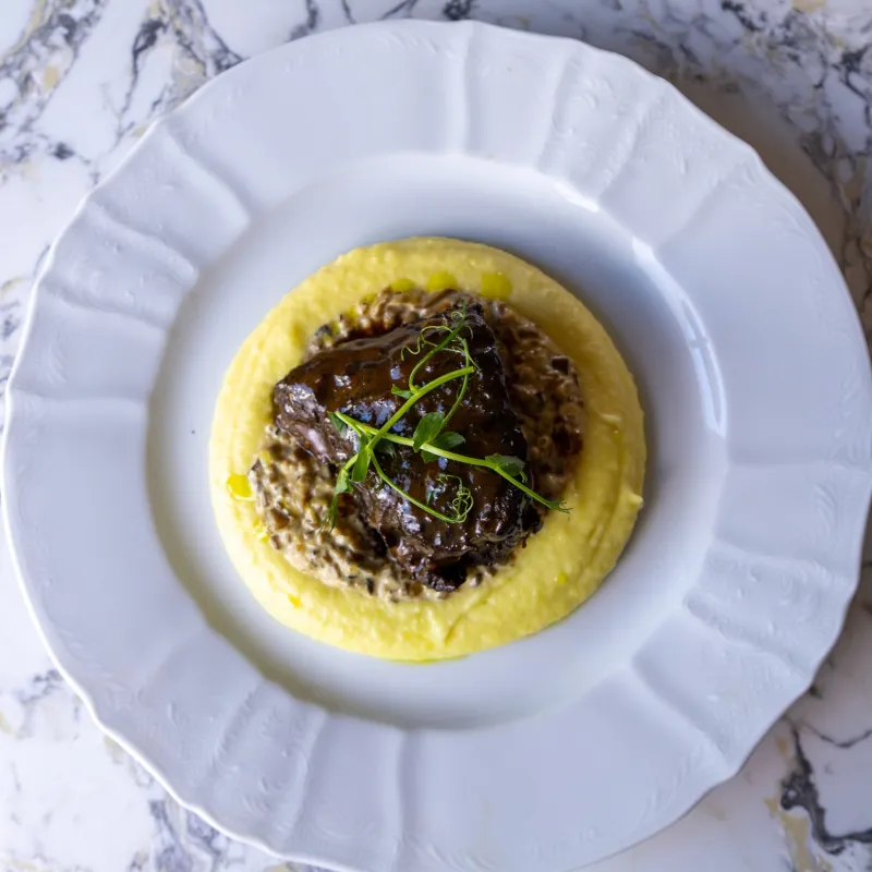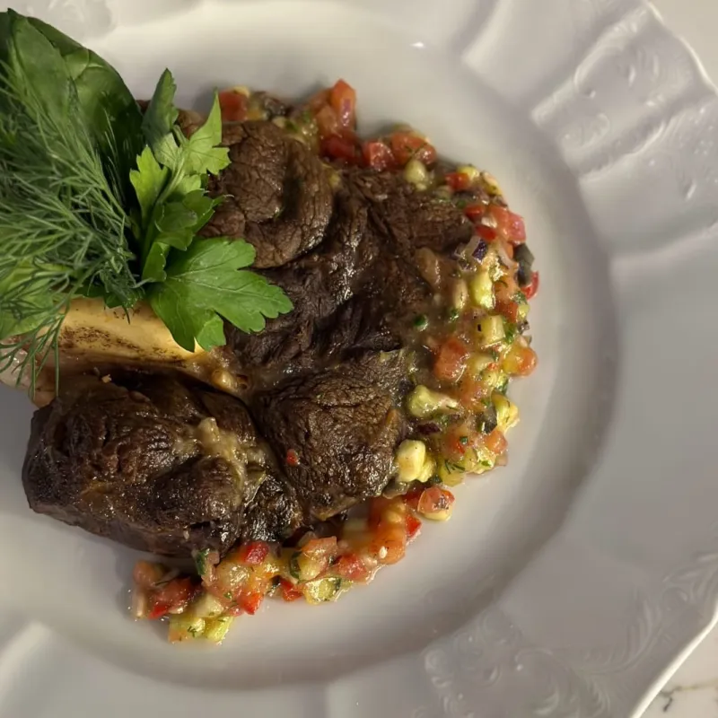 Традиционное блюдо кухни Ломбардии - тушеная телячья голяшка подается с овощной сальсой и грибным соусом