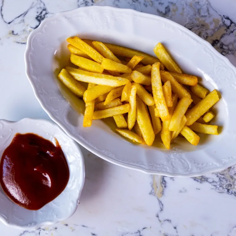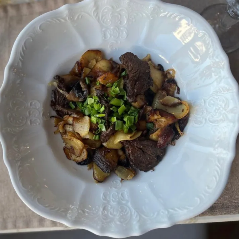 (жаренный картофель, грибы вешенки, мясо говядины)