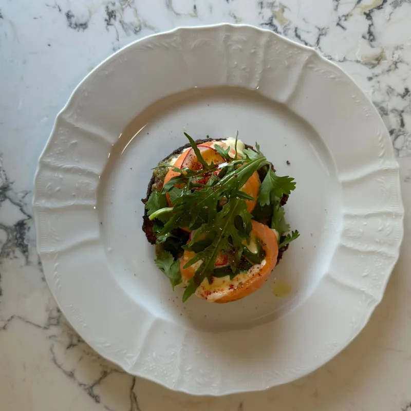 (яйцо, булочка, лосось, руккола, кинза, редис, гуаккомоле)