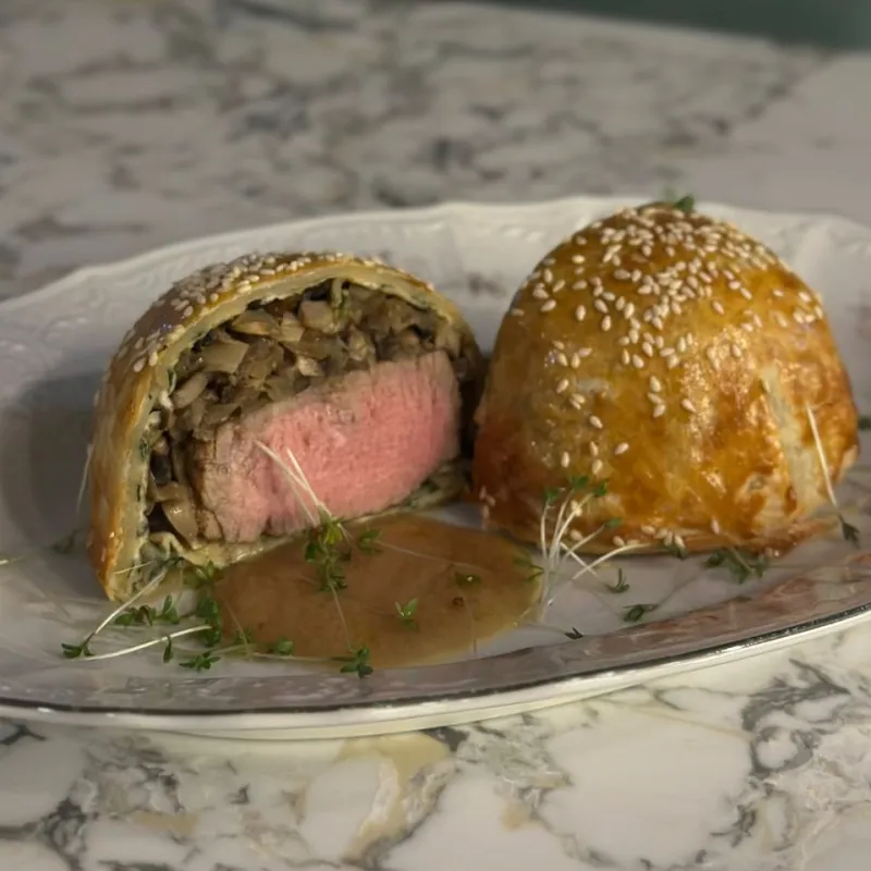 Традиционное английское блюдо на Восточный манер из говяжьей вырезки в слоеном тесте с начинкой из грибной пасты