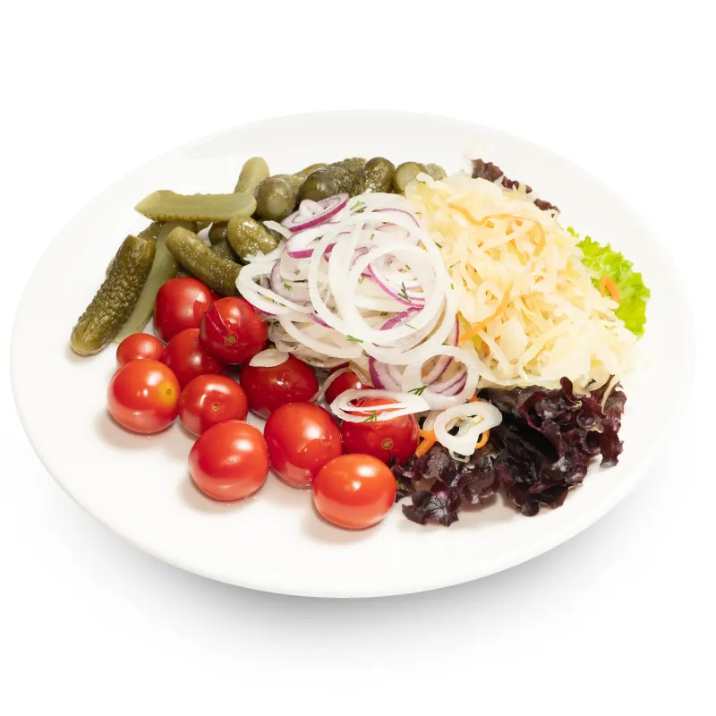 (помидоры, паттисоны, огурцы соленые, грибы, лук красный, зелень)
