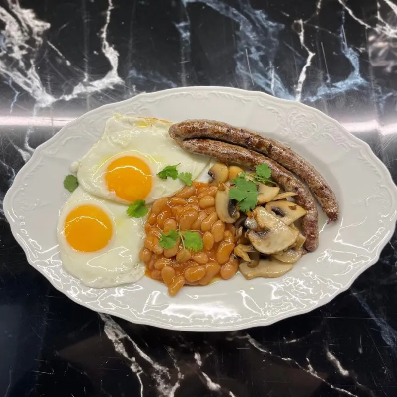 (яйцо, фасоль, грибы, говяжьи колбаски)