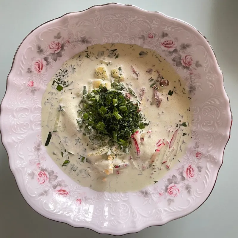 (редис, томаты, огурцы, сметана, красный и зеленый лук)