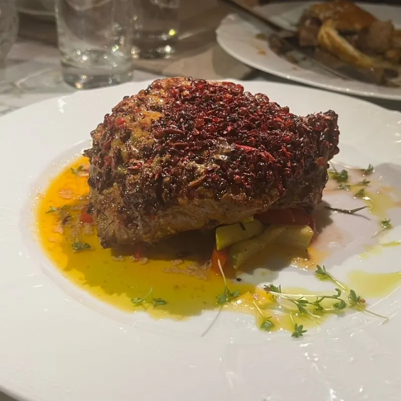Классический пеппер стейк из нежной говядины, подается на овощной подушке томленой в домашнем вине