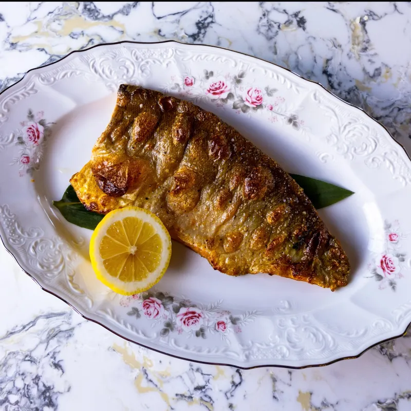 (форель, лимон, лист бамбука)