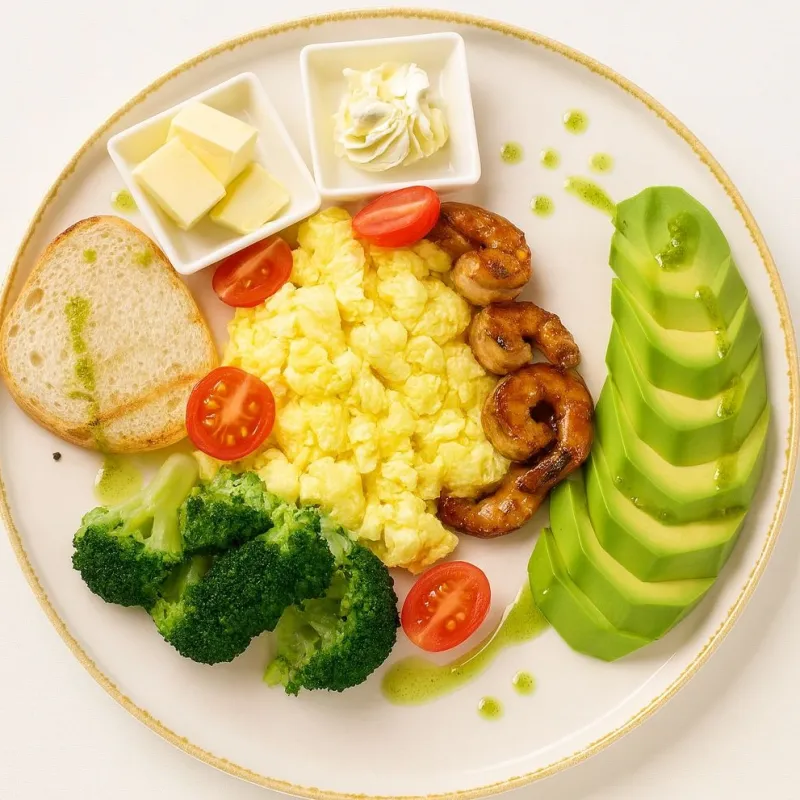 (яйцо, креветки, горошек, авокадо, черри)