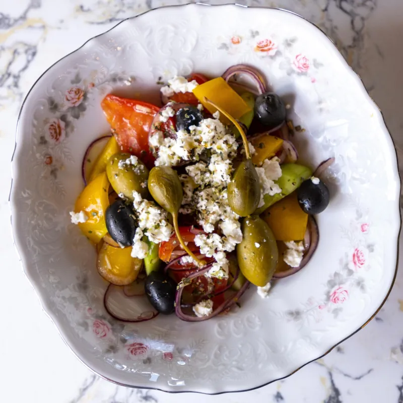 (перец болгарский, помидоры, огурцы, оливки, каперсы, маслины, лук красный, сыр салакис)