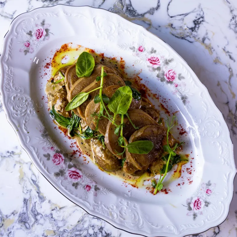 (язык говядины, шпинат, картофель baby)