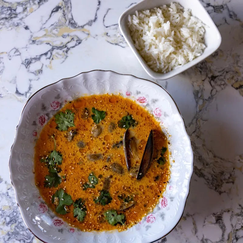 (креветки, черри, грибы вешенки, рис, молоко кокосовое)