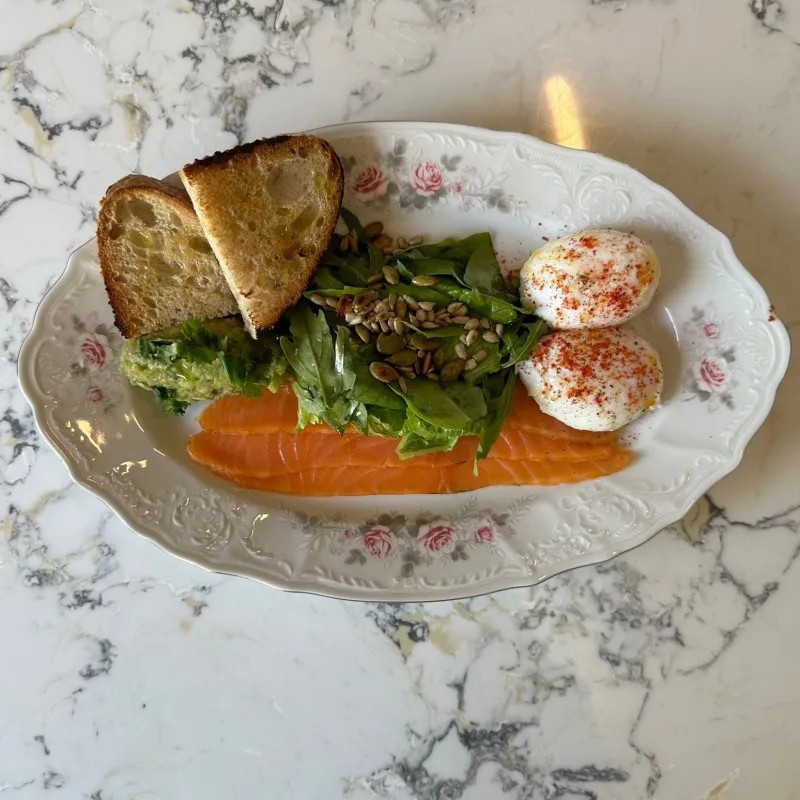 (2 яйца пашот, семга, руккола, гуакомоле, 2 кусочка поджаристого хлеба, семена тыквы и подсолнуха)