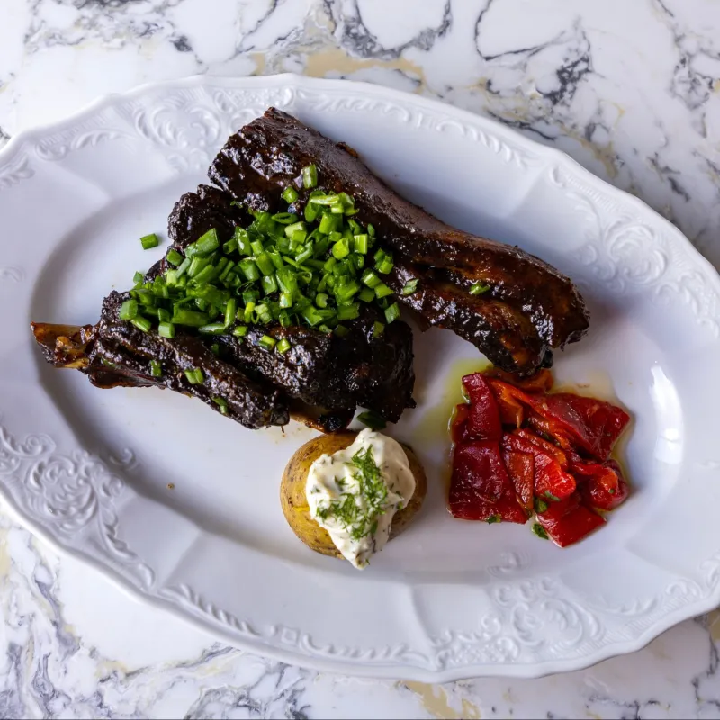 (томленное ребро коня, отварной картофель, соус чесночный, мариновонный полугорький перец)