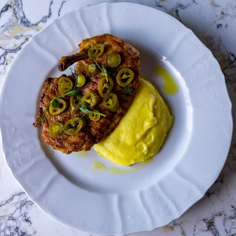 (половина цыпленка, картофельное пюре, халапеньо)